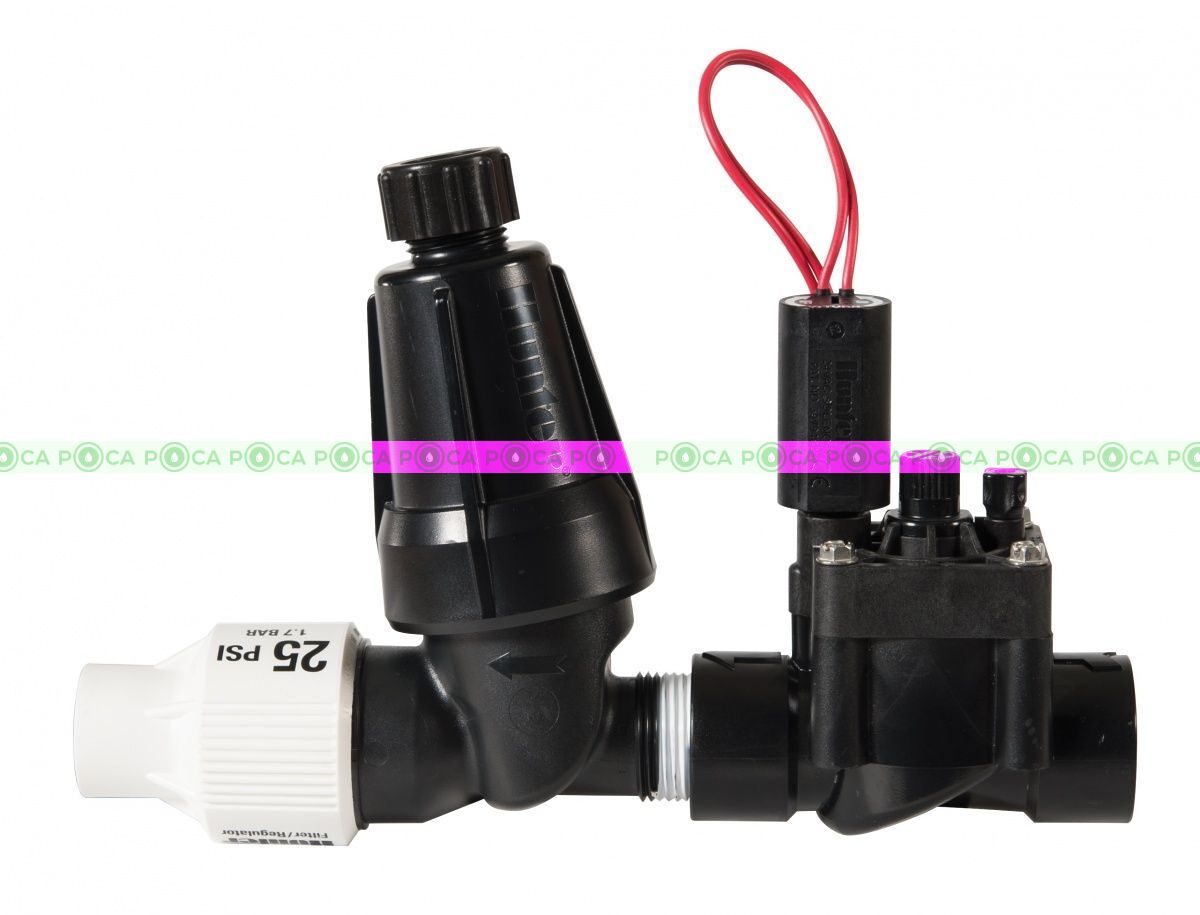 Комплекты представляют собой собранные на заводе конструкции, состоящие из популярного электромагнитного клапана PGV, фильтра и регулятора давления, предназначенные для управления зоной капельного полива. Клапаны PGV изготавливаются из высококачественных материалов, крышка корпуса сделана из армированного стекловолокном нейлона. Конструкция включает фильтр из нержавеющей стали, промывочную крышку для очистки фильтра и регулятор давления, для поддержания в системе давления 1.7 или 2.8 бар; 170 - 280 кПа.