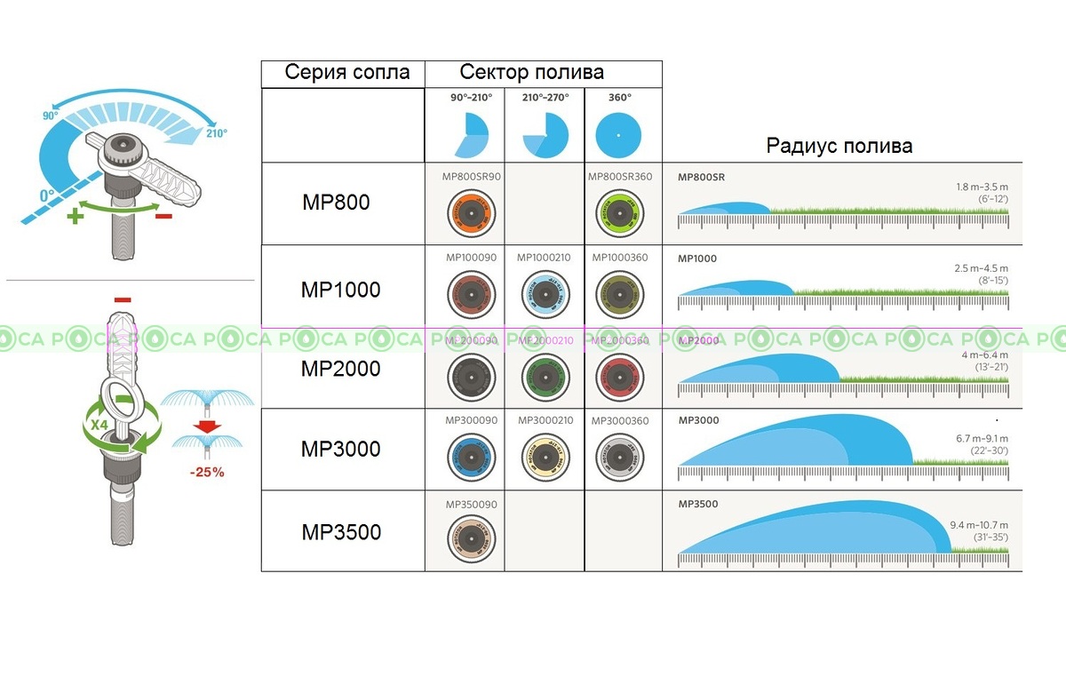 • Радиус полива можно уменьшить до 25% во всех моделях.